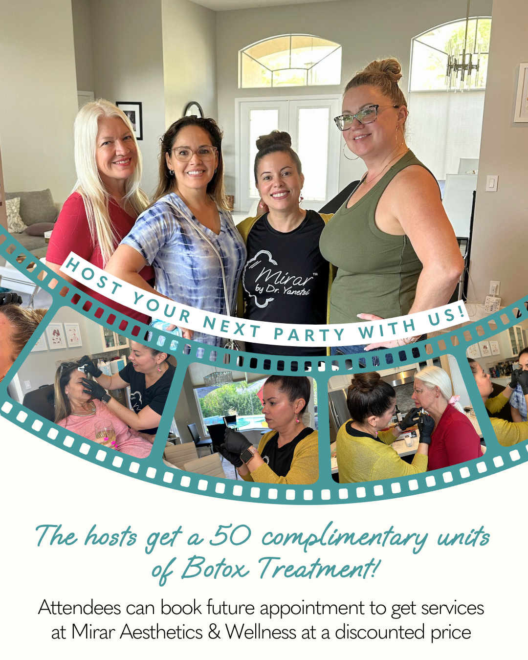 Mirar offers medical injectables outside of our studio, for memorable parties and special events inside homes and local businesses. Invite your clients, colleagues, and community to treat themselves to non-invasive aesthetics with Dr. Yanetsi. A $500 deposit must be made and will be used towards exclusive pricing on treatments.